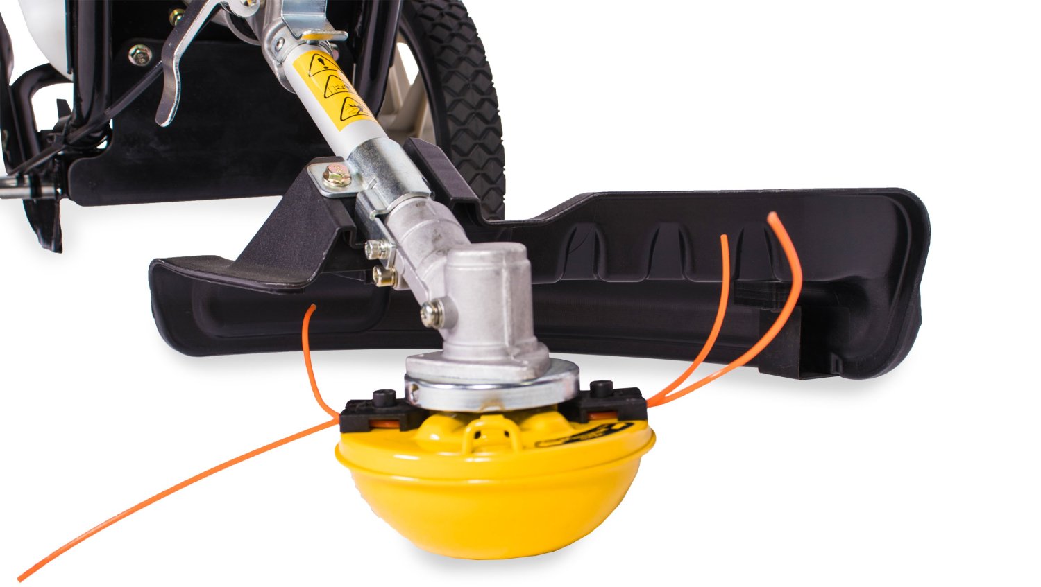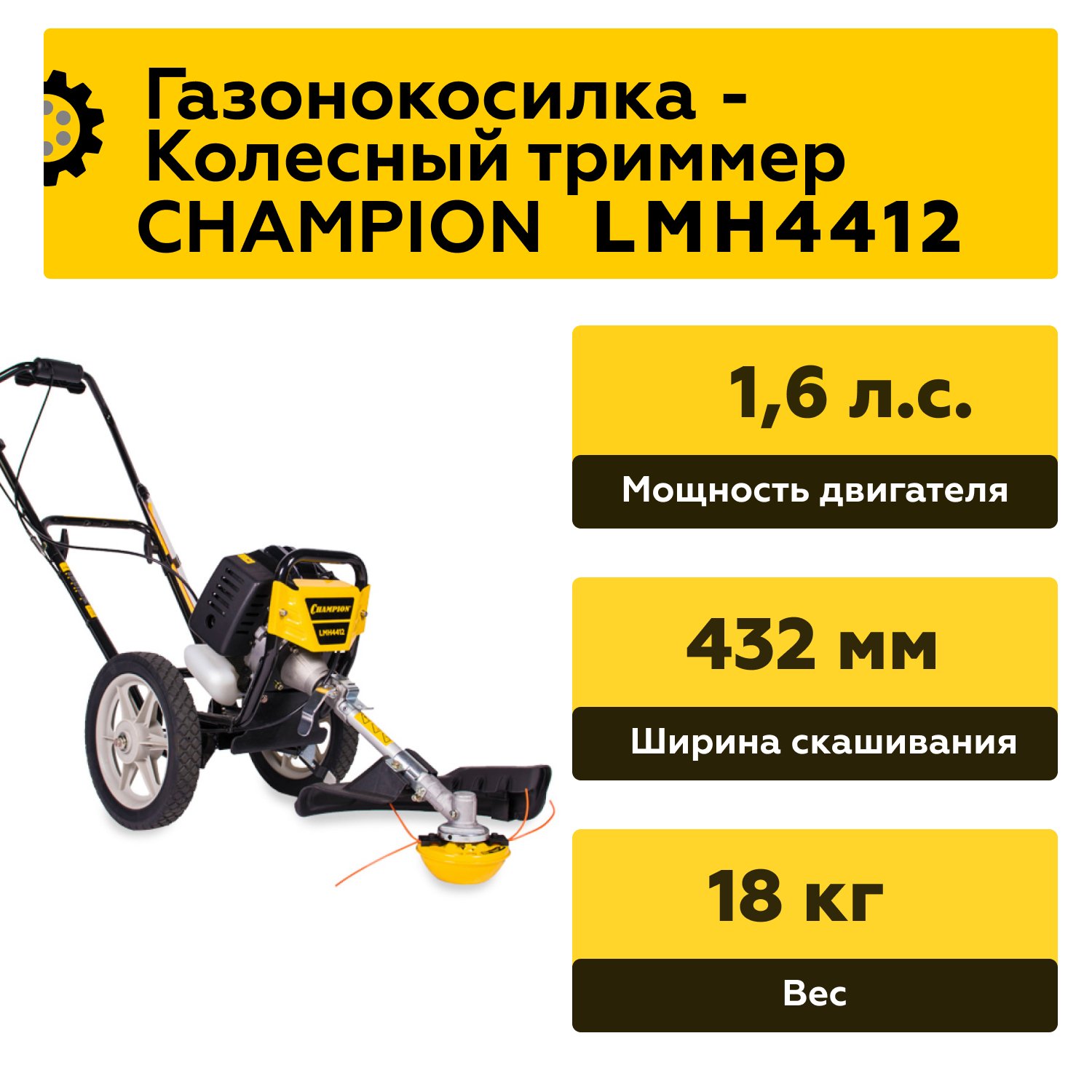 Триммер колесный Champion LMH4412 имеет без ремённую передачу крутящего момента под нужным углом, благодаря применению стального углового редуктора, перекочевавшего на этот инструмент от обычных бензиновых кос. В основании редуктора крепиться широкий защитный кожух для защиты оператора от летящей на большой скорости скошенной травы. Колесная тележка, на которую опирается конструкция, имеет плавный ход и хорошую проходимость по высокой траве, благодаря колесам большого диаметра.