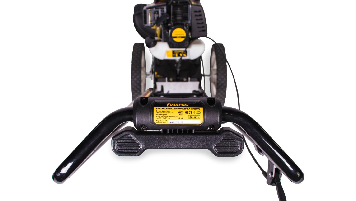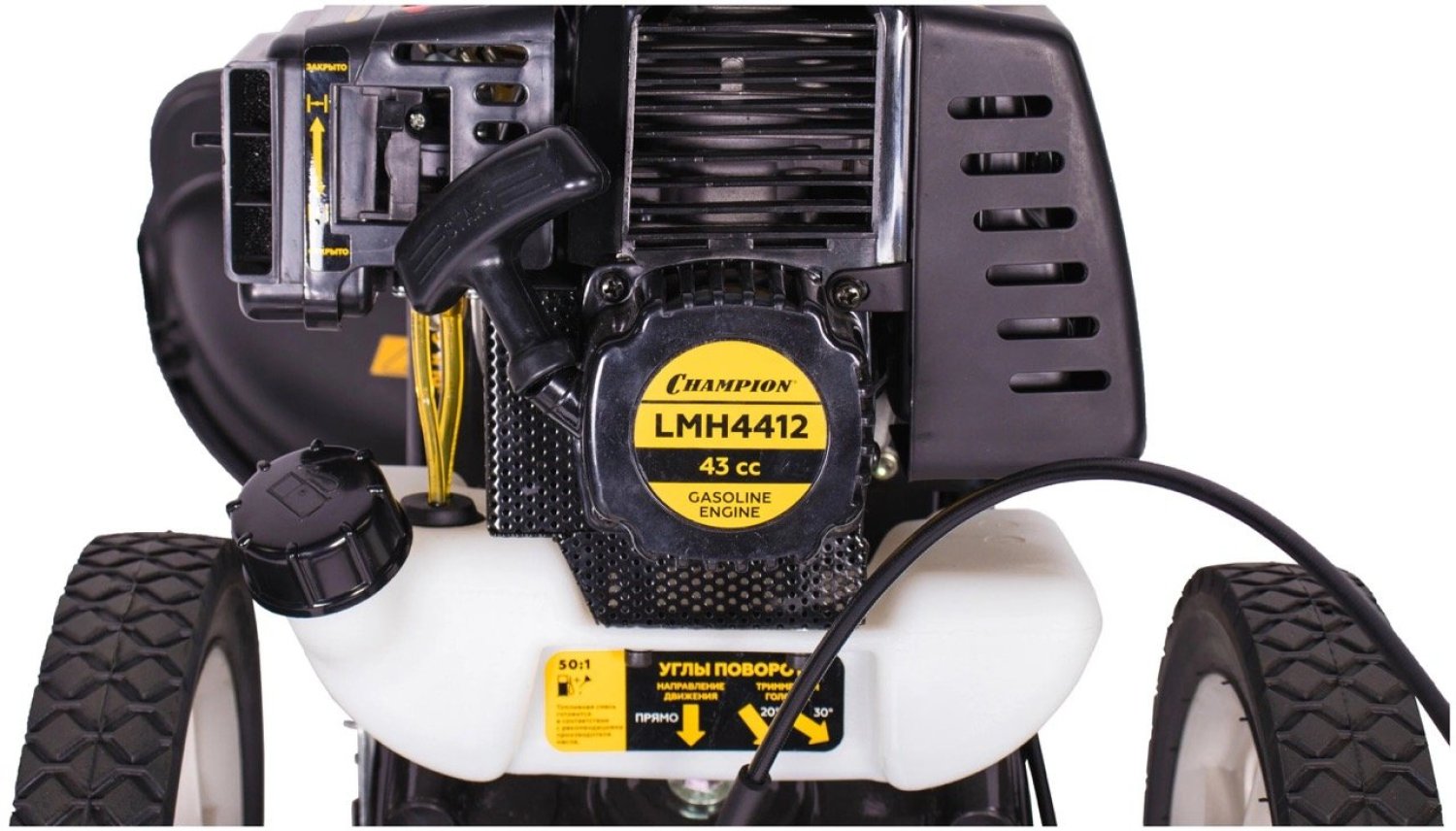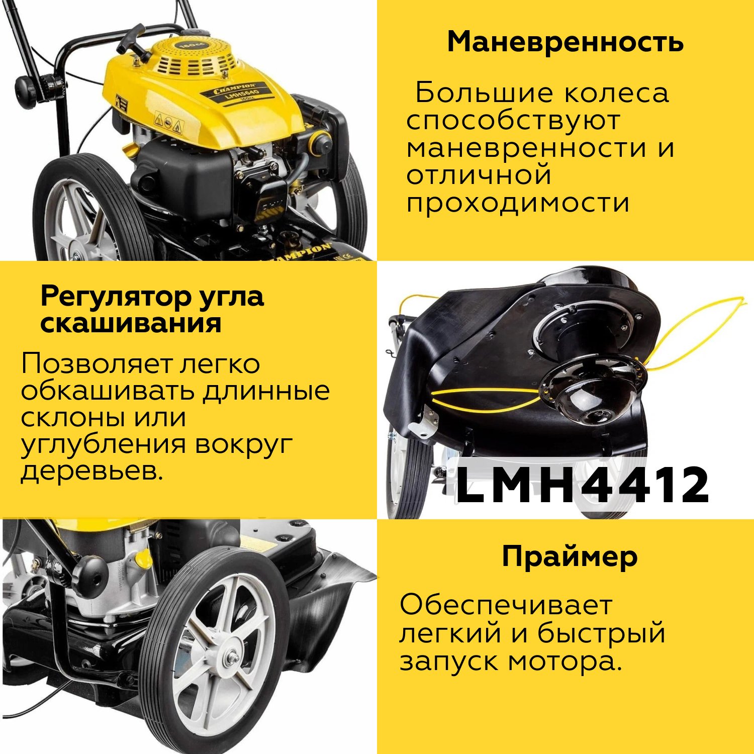 Триммер колесный Champion LMH4412 так же оборудован центробежным сцеплением в виде муфты, позволяющим находиться в покое режущему элементу при заведенном двигателе, пока оператор не выжмет ручку газа. Благодаря двухтактному двигателю, модель можно применять на существенных склонах.