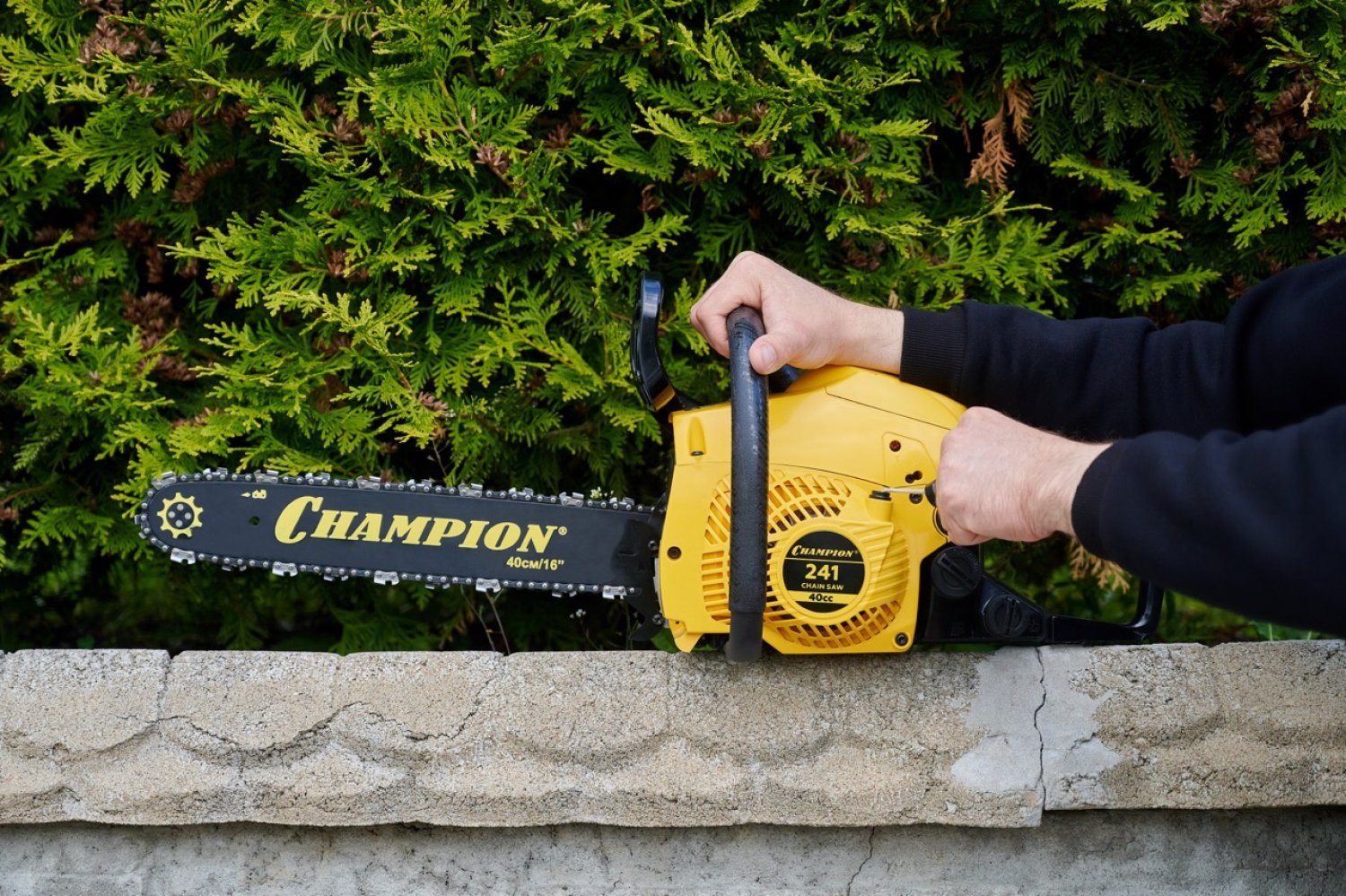 Бензопила Champion 241-16 - Мощная бытовая модель для заготовки дров и помощи при деревянном строительстве. Легко пропилит сруб или брус в чашу или в лапу, а так же поможет свалить ненужные на участке деревья. При небольших габаритах, имеет длинное пильное полотно (40 см.).