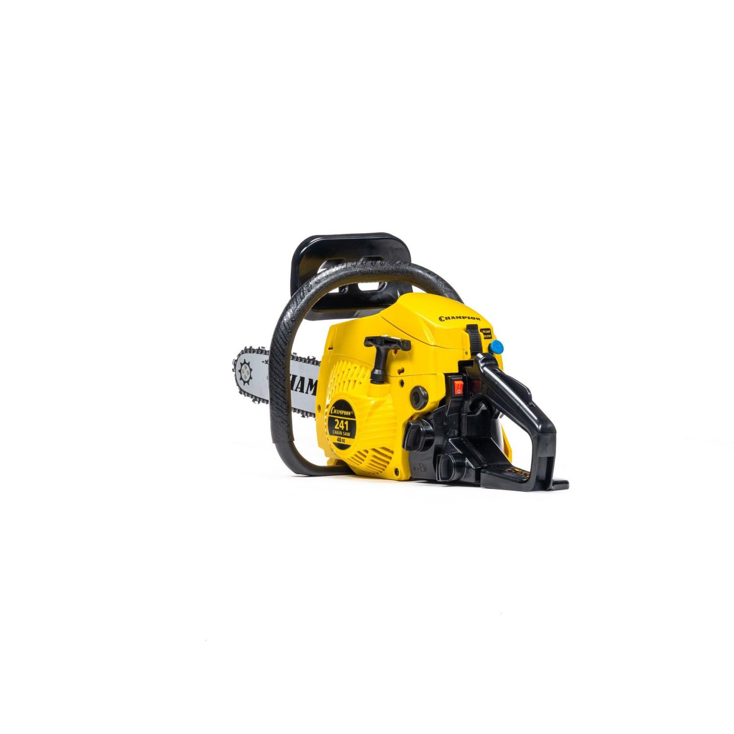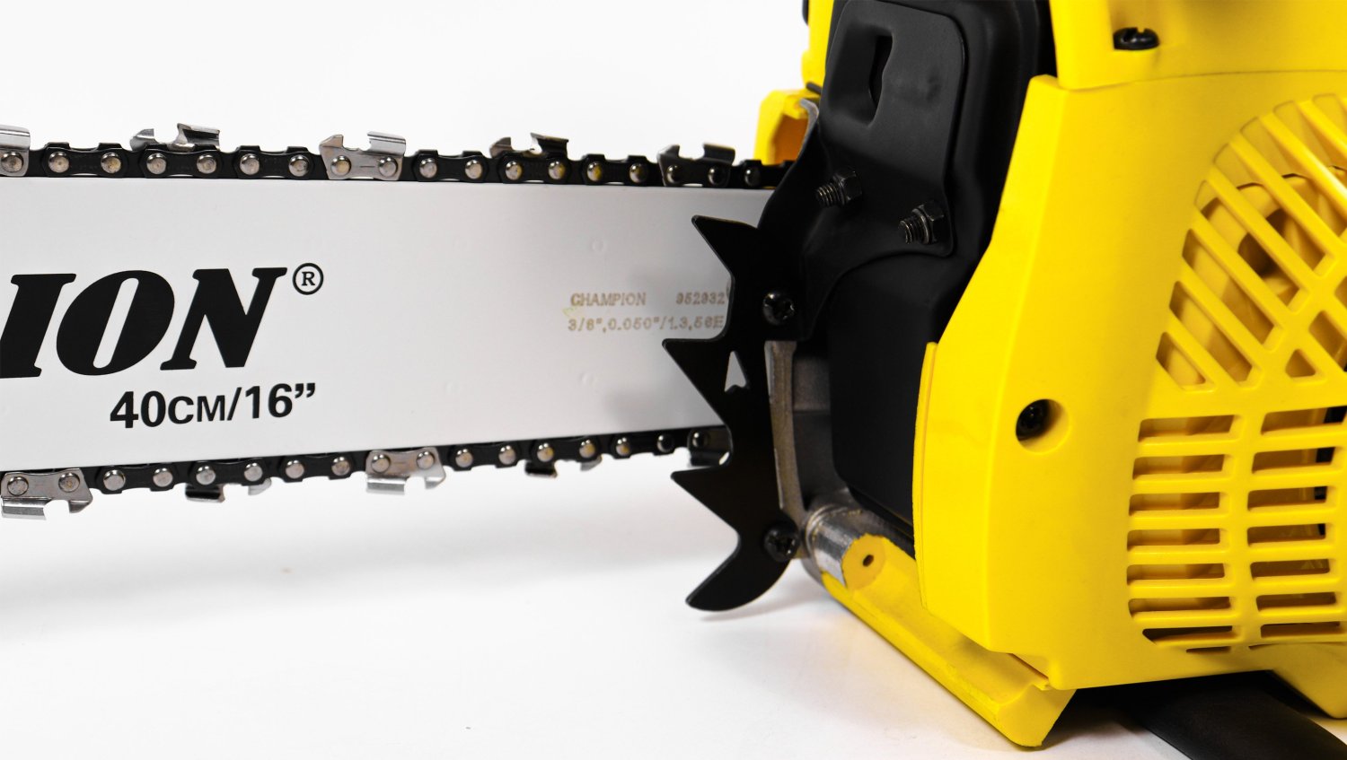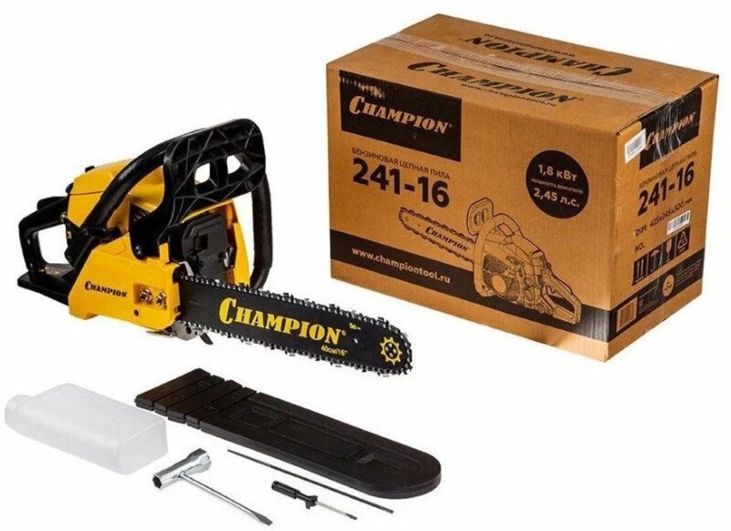 Мощность пилы составляет 2,45 лошадиных сил, а сам двигатель изготовлен с хорошими допусками, благодаря чему относится к классу ЕВРО-3 и использует топливную смесь с минимальным количеством двухтактного масла (50:1), всего 20 грамм на 1 литр бензина, как у европейских и американских брендовых пил. Бензопила Champion 241-16 поставляется со стандартной пильной цепью шагом 3/8 дюйма. Натяжка цепи производится посредством стальной натяжной рейки, ключом, поставляемым в комплекте пилы, а прижим пильного полотна производится двумя стальными гайками. Такая конструкция менее удобная, чем новомодные системы упрощенной натяжки, но более надежная и долговечная.