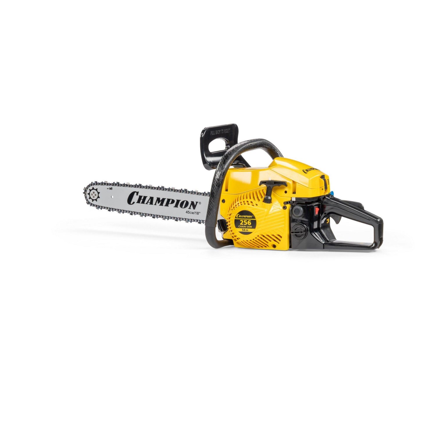 Длина пильного полотна составляет 45 см, что позволяет валить деревья большого диаметра. Пильное полотно имеет ширину паза 1,5 мм, а его ведомая звездочка крепиться на четырех клепках. Бензопила Champion 256-18 оборудована надежным диафрагменным карбюратором, обеспечивающим уверенный запуск даже при отрицательных температурах. Для работы зимой у пилы предусмотрен подогрев карбюратора за счет направления на него горячих выхлопных газов.
