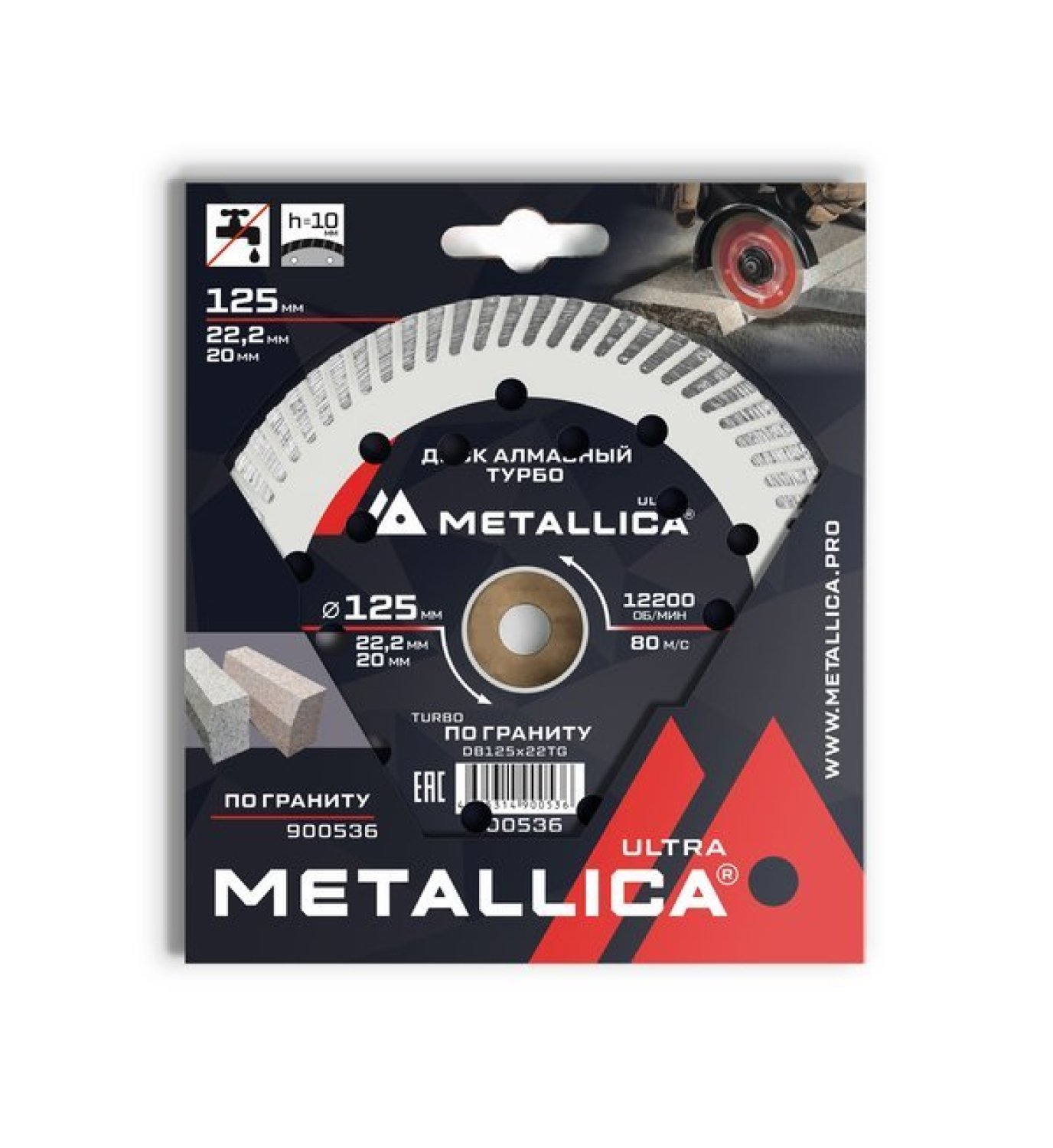 Серия ULTRA. Мод. DB125x22TG. Диаметр 125 мм, посадочное отверстие 22,23 мм, высота режущего алмазного слоя 10 мм, ширина пропила 2,4 мм, глубина пропила до 30 мм, максимальная скорость вращения 12200 об/мин (80 м/с). Рекомендуемая толщина пиления каменной плиты 15-25 мм.