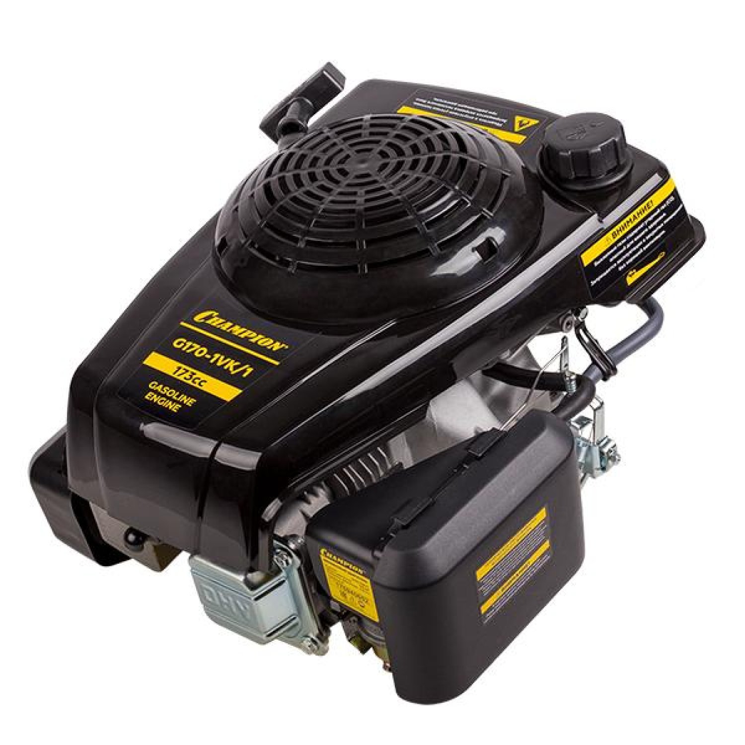 Двигатель Champion G170-1VK – мощная четырёхтактная модель с вертикальным выходным валом. Двигатель выдает внушительную мощность в 5,5 лошадиных сил. Построен мотор по четырехтактной схеме с верхним расположением клапанов. Такой конструктив позволяет мотору создавать меньше шума при работе, а так же потреблять меньше топлива. Двигатель издает гораздо меньшую вибрацию, а его выхлоп более экологичен чем у двухтактных двигателей. Поскольку вал мотора выходит вертикально вниз, то основным видом инструмента, на который можно установить мотор, являются бензиновые роторные газонокосилки или культиваторы с червячным редуктором.