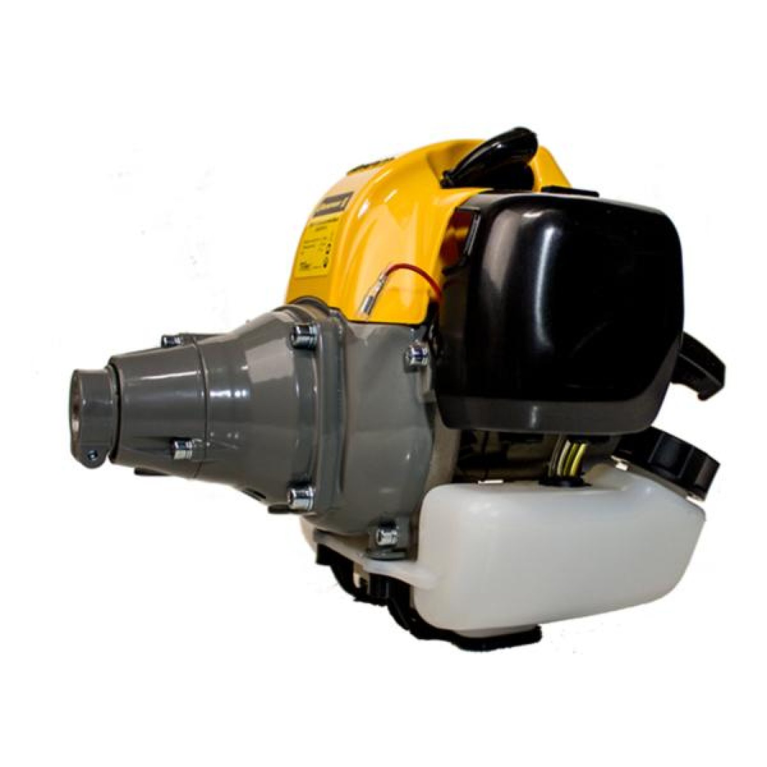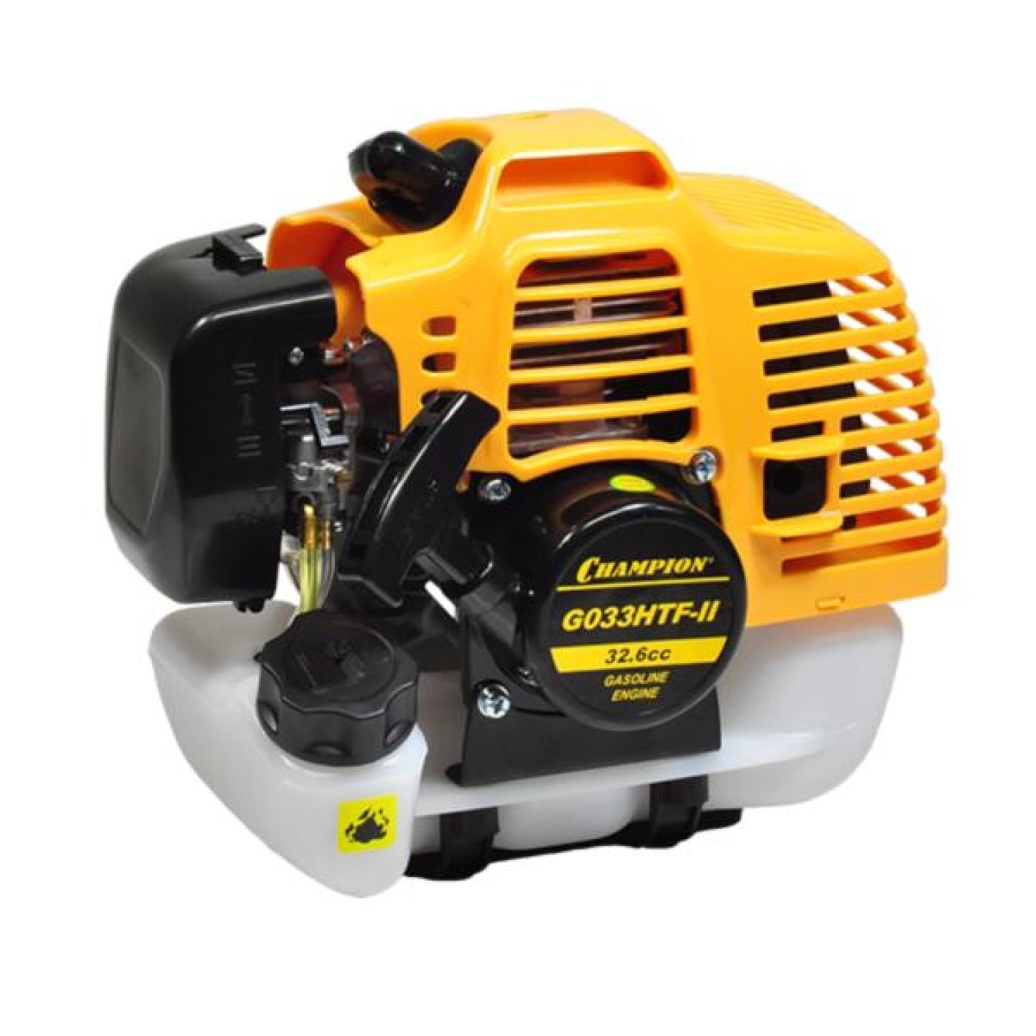 Двигатель для триммера Champion G033HTF-II – модель средней мощности для использования на триммерах и другой садовой технике. Двигатель достаточно легкий его вес немногим менее 4х килограмм. Двигатель имеет центробежное сцепление, не дающее вращаться катушке с леской или диску на холостом ходу. Для запуска, не прогретого мотора, есть двухпозиционная воздушная заслонка, как на карбюраторных автомобилях. При запуске холодного двигателя заслонка переводиться в закрытое положение, а если мотор уже прогрет, тогда используется запуск уже на открытой заслонке. Непосредственно сам запуск производится за счет продергивания шнура. Двигатель Champion G033HTF-II имеет транзисторное зажигание. В качестве топлива используется смесь двухтактного масла и бензина марки АИ-92. Пропорция смешивания 50:1 (на 1 литр бензина разбавляется 20 мл. масла). Двигатель раскручивается до 3000 оборотов в минуту. Бензиновый бак защищен в нижней плоскости стальной подставкой.