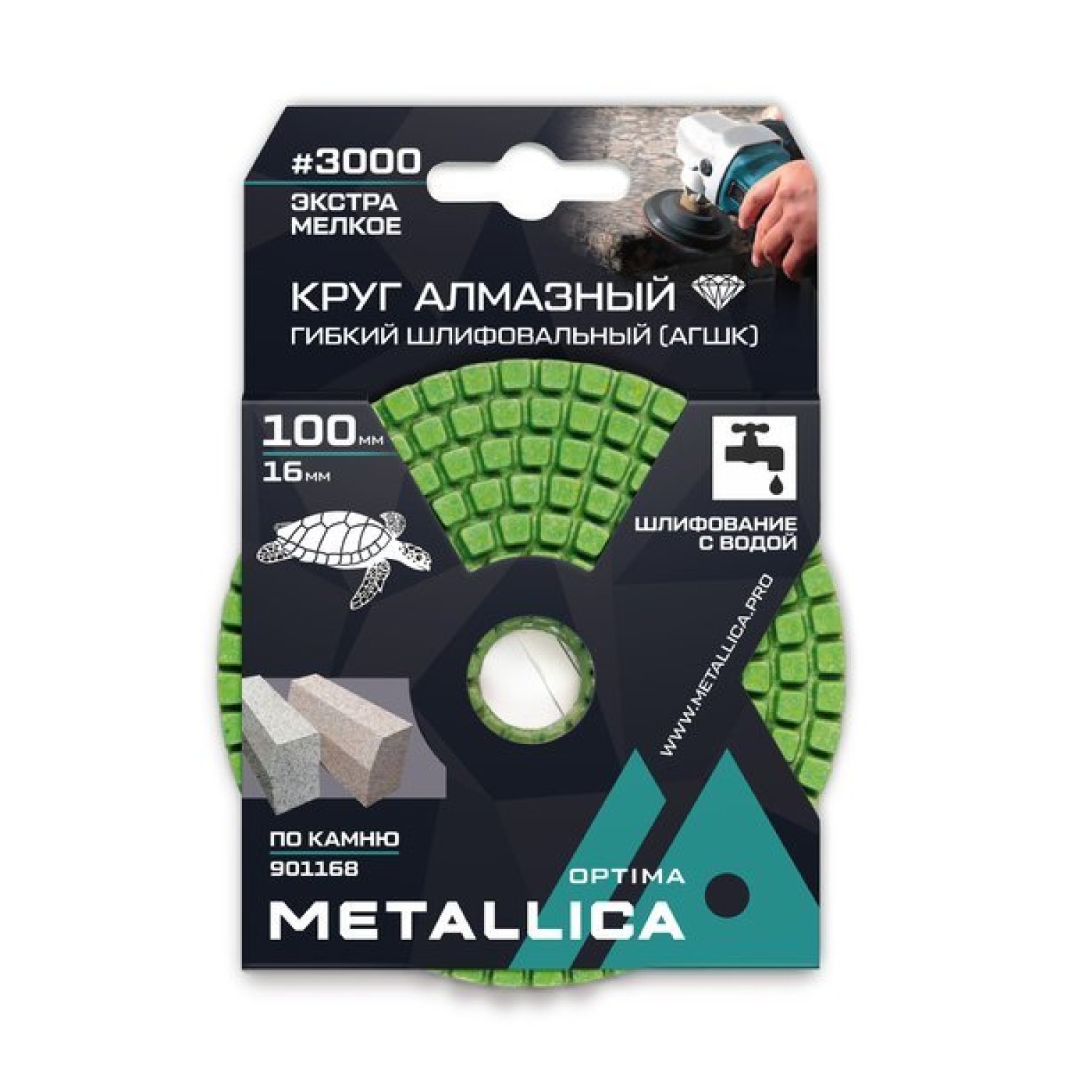 Специальный рисунок рабочей поверхности для оптимального распределения охлаждения по всей площади. Связка нанесена на матерчатую основу Velcro (репейник) для надежного крепления на шлифовальной подошве. Использовать охлаждение водой.