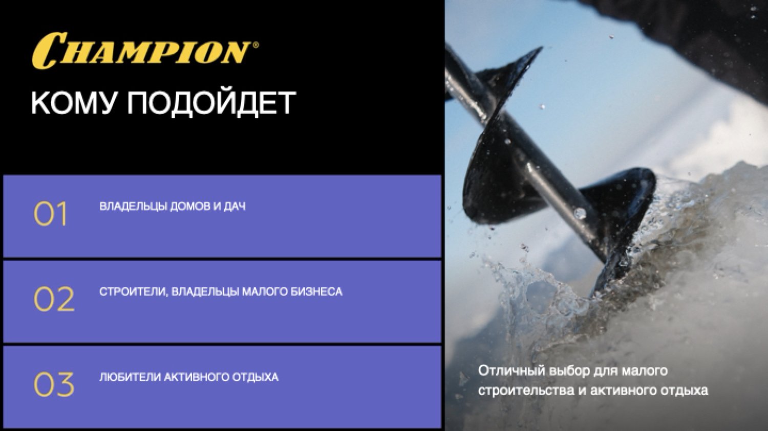 Мотобур CHAMPION AG452A — это надёжный инструмент для эффективного бурения лунок диаметром от 60 до 200 мм. Оснащён бензиновым двигателем мощностью 1,46 кВт (1,99 л.с.) и рабочим объёмом 52 см³, он уверенно справляется с бурением в грунтах различной плотности — от мягкой почвы до мерзлого слоя.