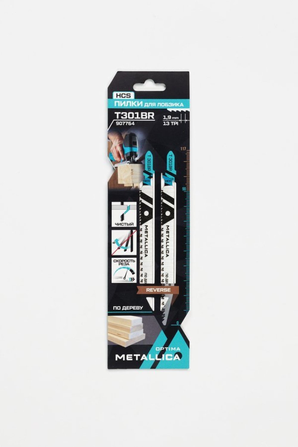Пилки для лобзика METALLICA Optima T301BR, 117/90мм шаг 1,9мм, HCS обрат/зуб, чист. рез, по дер. 2шт