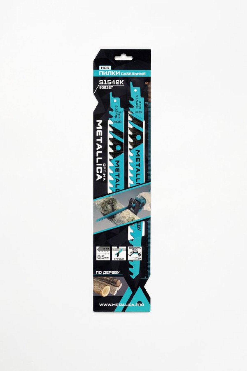 Направление зубов - в сторону хвостовика. Зубы фрезерованные, прямого сечения, разведены для снижения трения в пропиле. Японский тип зубов в форме трапеции с режущим углом 0 град и задним углом 15 град. - для улучшения режущих качеств на обратном ходу. Шаг зубов широкий - 8,5 мм (3 TPI).
