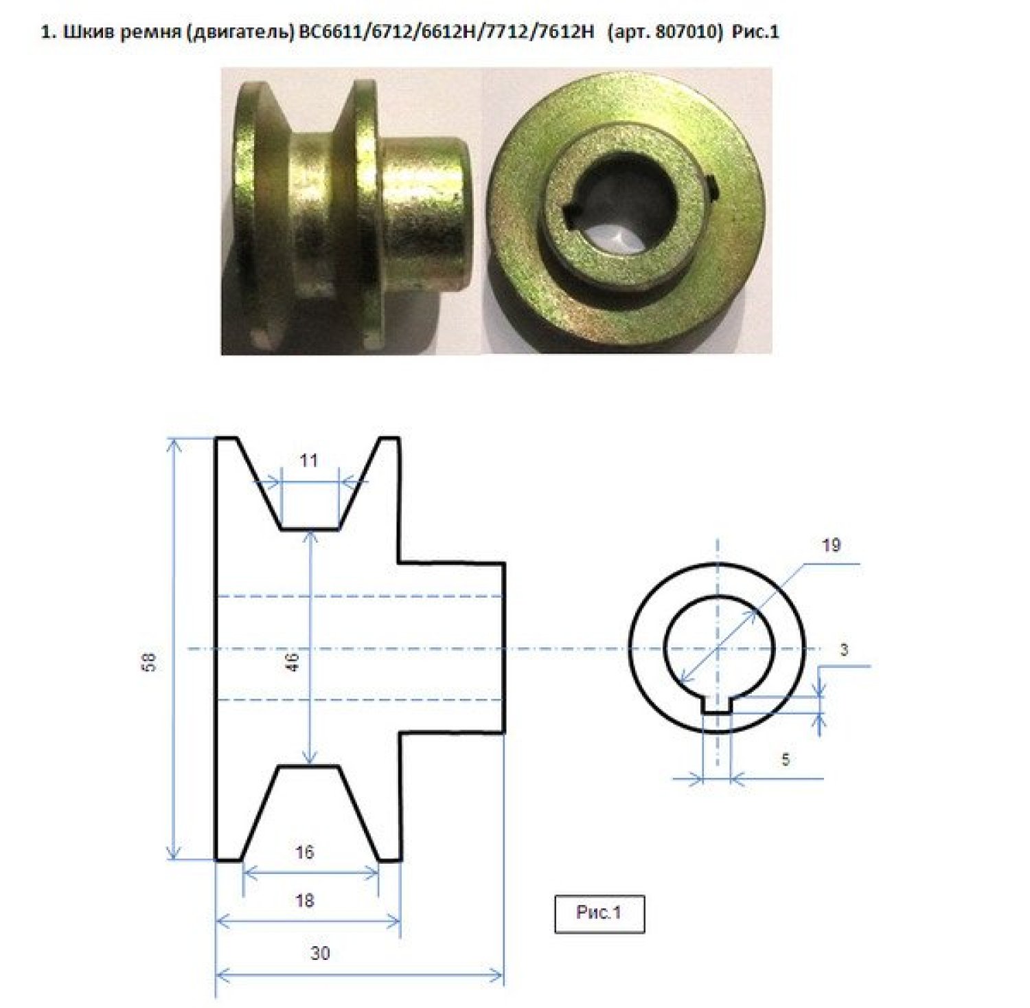 Шкив ремня BC6611, BC6712, BC6612H, BC7712, BC7612H, BC8713 двигатель, на один ремень, 19мм